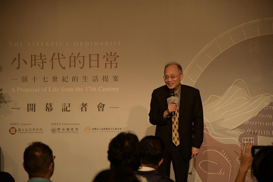 記者會上除故宮院長吳密察,副院長黃永泰,策展人器物處處長余佩瑾親自出席外,慷慨商借展品之成陽藝術文化基金會執行長宋信德亦蒞臨現場,作家駱以軍亦受邀分享其「玩物」心得。針對這次展覽的主題,吳密察笑道常有人提「吃飽閒閒,玩物喪志」,而文震亨的《長物志》其實即鼓吹「喪志」,但這文人玩得起,展現的不只是富足,還有品味。展覽跳脫歷史學家講的大時代,闡述的是一個有文化的小時代,吳密察期許用這種新穎形式來談故宮藏品,能獲得大眾喜愛。