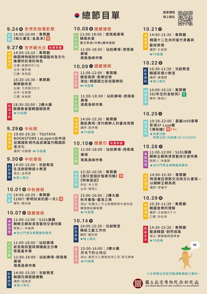 故宮推出的系列活動不限於藝術,廣及電影、韓語、韓服、茶道,甚至計畫統整嘉義地區韓國料理店家,期待「探索韓國文化的DNA」,形塑出一趟深度的韓文化之旅。