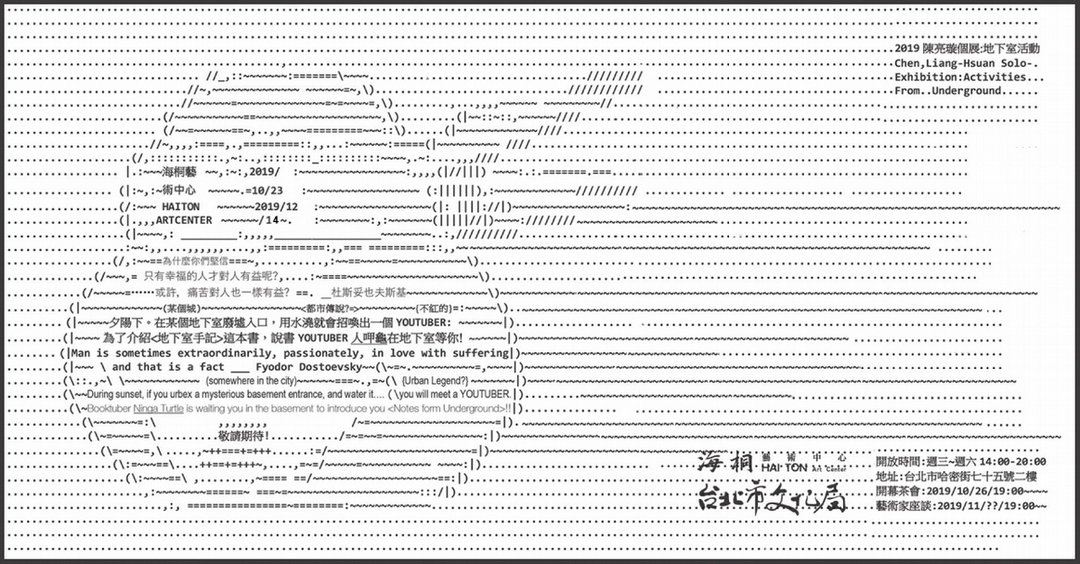 陳亮璇的個展「地下室活動」作為台北時光三部曲的插曲,就像是B面一樣作為一個平行架空世界,展場佈置似乎有跡可循,像是參照了多部電影(銀翼殺手2049、V怪客、忍者龜…)又或著只是一場抽象的、胡亂拼湊的幻想與恐慌。而埋藏在這造景裡的唯一主角,卻是一個喃喃自語的廣播者。Broadcast yourself據說是一個管道,可以自由自在地表達自己,但是努力成為影像的那一刻,卻是更直接接受一場價值觀與秩序的管理,個人與龐大的社會結構互相交涉,存於城市中的過去、現在、往未來。「地下室活動」中主要的活動是觀看一個youtuber的說書影片。矛盾的是,這或許根本不配被稱為一個活動。展場中的敘事讓人搞不清時序、也分不開空間中各個聲音與影像的界線,像是末日風暴的橘紅色光暈照映大半邊展場,戰機、雨聲和洞穴水滴聲串接各個角落。