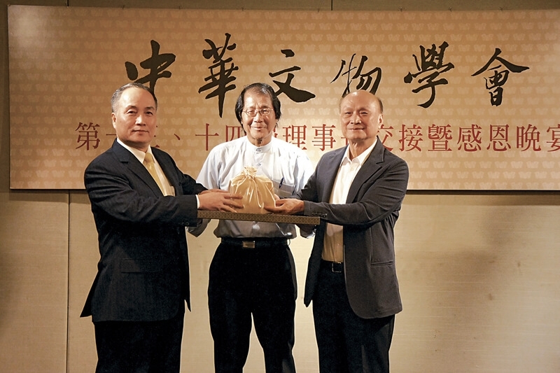 中華文物學會第14屆理事長王水衷(左)由監交人常務監事莊芳榮手中,接下第13屆理事長林木和(右)手中印信。攝影︱中華文物學會