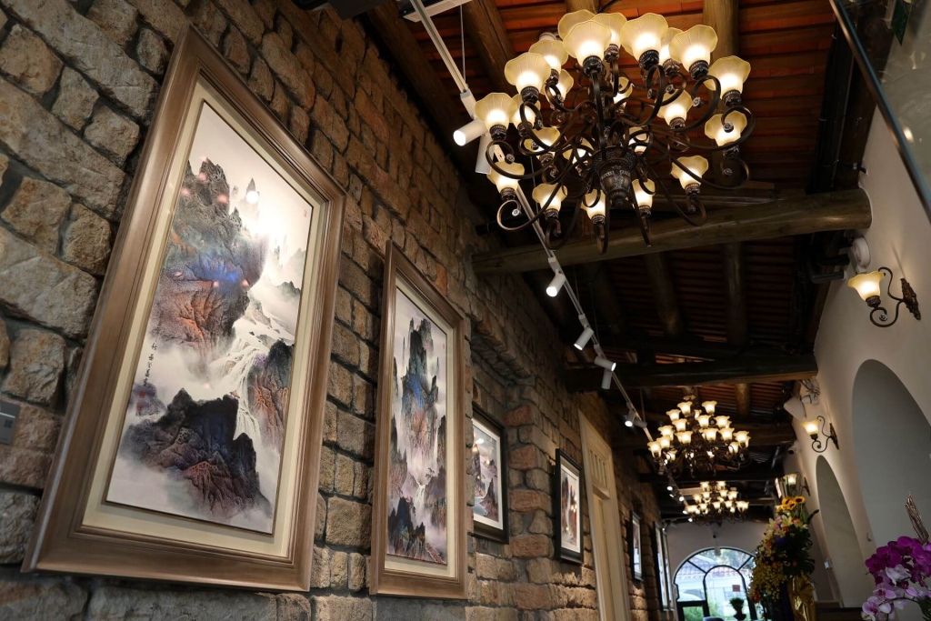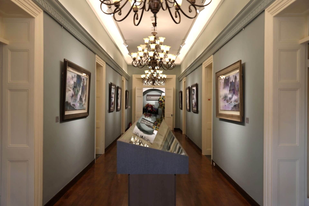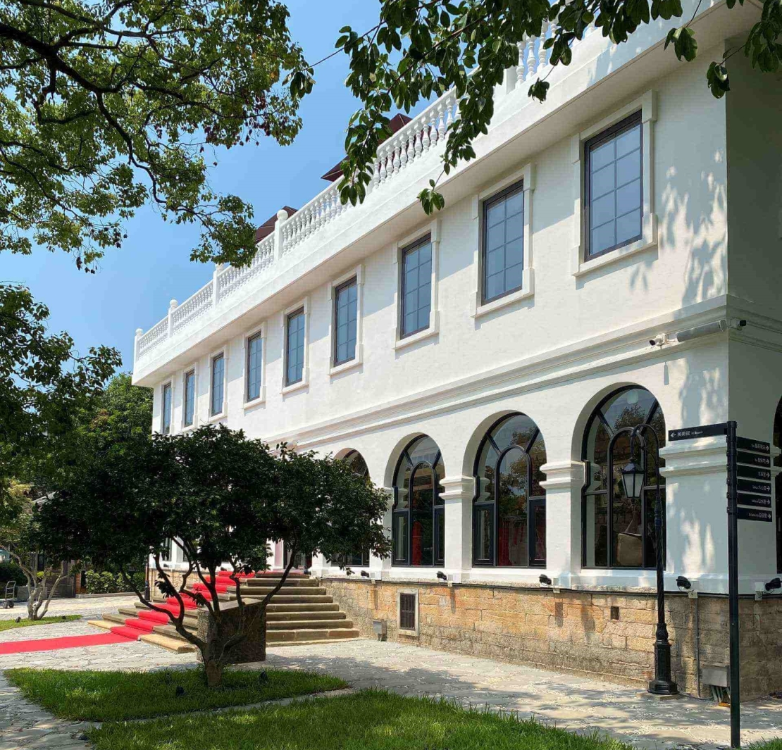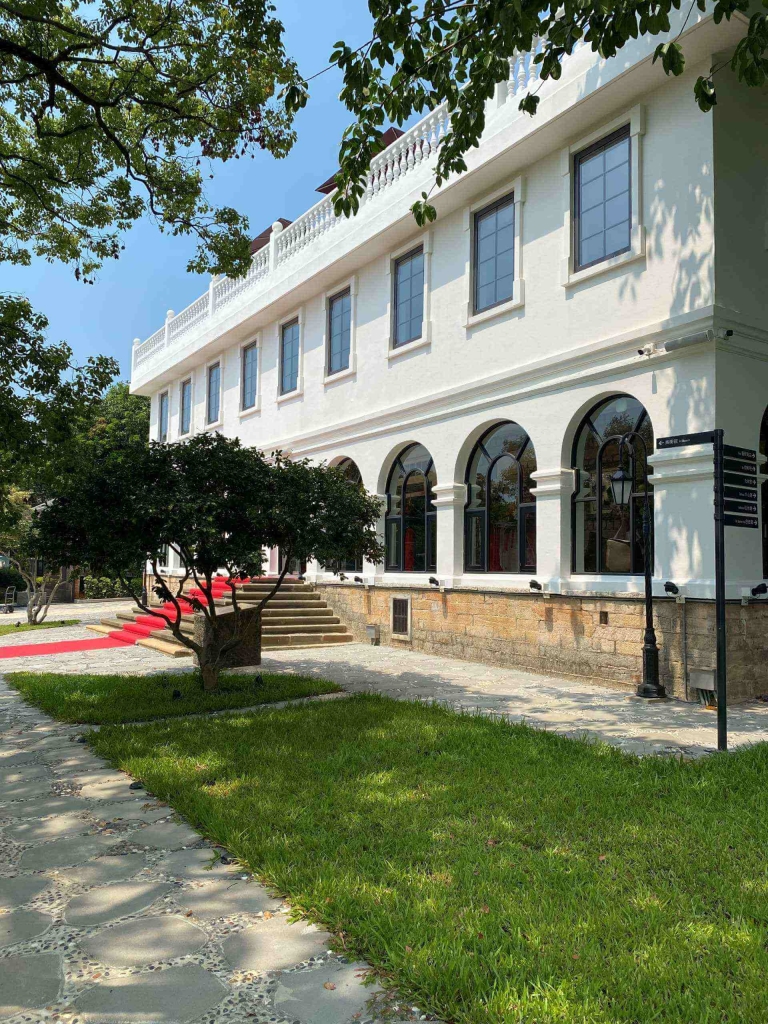 走進園區,印入眼簾的是一棟白色西洋建築,建築為兩層樓,陽光下的綠植樹木在美術館入口前錯落,枝葉隨風灑落在陽光下搖曳。建築內光線從玻璃窗外瀉入,百年石壁迴廊掛滿一幅幅精彩的畫作,展廳內保留了原建築的懷舊氣質,入門處一排耀眼的水晶吊燈,鋪上紅地毯的木質地板,以及充滿生活氣息的燃木壁爐,展現傳承與創新的完美平衡。傍晚時分,隨著建築外側面的扶搖梯迴旋直上,漫步美術館頂層遼闊的觀海臺,瞬間便能將著名的「觀音夕陽」美景盡收眼底,無比愜意。