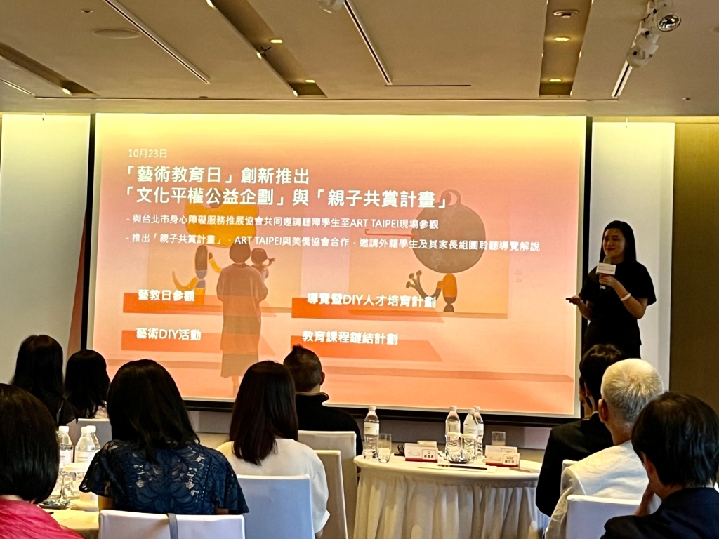 由教育部推出的「文化平權公益企劃」、「親子共賞計畫」與ART TAIPEI合作舉行的「藝術教育日」已邁入第八年。今年特別規劃兩項新舉措:「文化平權公益企劃」,與台北市身心障礙服務推展協會共同邀請聽障學生至ART TAIPEI參觀,並聘請專業手語導覽老師予以解說;另一項則為「親子共賞計畫」,ART TAIPEI與美僑協會合作,邀請外籍學生及其家長組團聆聽導覽解說 ,親子間共賞作品不僅是極佳的互動機會,這也將成為台北藝博另一道溫馨的風景。