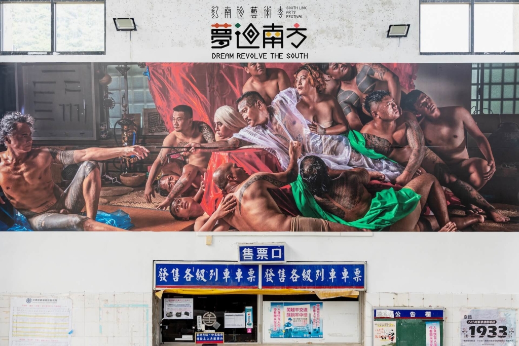 流動的當代樣貌從大武瀧溪車站內,由排灣族傳統拍刺師宋海華(Cudjuy Patjidres)與紐西蘭薩摩亞裔的葛雷格.山穆(Greg Semu)合作共創的《雕刻身命》開始。葛雷格.山穆將米開朗基羅在文藝復興時期繪製在西斯汀教堂的「創世紀」與林布蘭特的「解剖學」兩幅西洋名畫,重新以攝影與戲劇性的方式藉由畫作內的人物與紋身語彙來闡述南島民族的遷徙。影像中的主角即是台東在地且台灣唯一傳統拍刺紋身藝術家宋海華,同時扮演上帝與導師兩個角色,來表達南島民族以紋身尋找遷徙的故事與傳統文化的傳承,藉由兩幅西洋名畫的知名度,讓人能快速理解其中的南島文化。