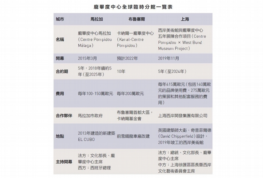 在此同時,龐畢度中心也從和西班牙馬拉加的合作,逐漸確立以「臨時美術館」(pop-up museum)向海外輸出龐畢度品牌的策略。畢卡索的故鄉,位於西班牙南部的馬拉加,同樣受到畢爾包從暮氣沈沈的舊工業城市翻轉為國際藝術勝地的啟發,希望藉由國際美術館品牌,創造驚人的槓桿效力,刺激城市的復甦和更新。於2015年3月底揭開帷幕的「龐畢度中心馬拉加」(Centre Pompidou Málaga)同時也是龐畢度中心在海外測試「臨時美術館」概念的第一個「實驗室」:在這項為期五年的合作計劃中,美術館由與當地市政府委託的企業負責興建和運營,龐畢度中心則提供典藏藝術品和組織齊全的展覽,以及公共教育等配套活動。龐畢度中心允許馬拉加「臨時分館」使用其品牌和形象,並且以包括繪畫、雕塑、攝影、建築或設計等近百件典藏作品,打造一座小型龐畢度中心,馬拉加市政府除了負責運營和展覽一切費用,包括作品運輸、保險,同時每年支付龐畢度中心100-150萬歐元的費用。「龐畢度中心馬拉加」自開幕以來截至2018年年底,吸引了近67萬名觀眾(每天約562人次),今年年初,甚至在合約尚未到期之前,馬拉加市政府已主動續約,將雙方合作延長至2025年。
