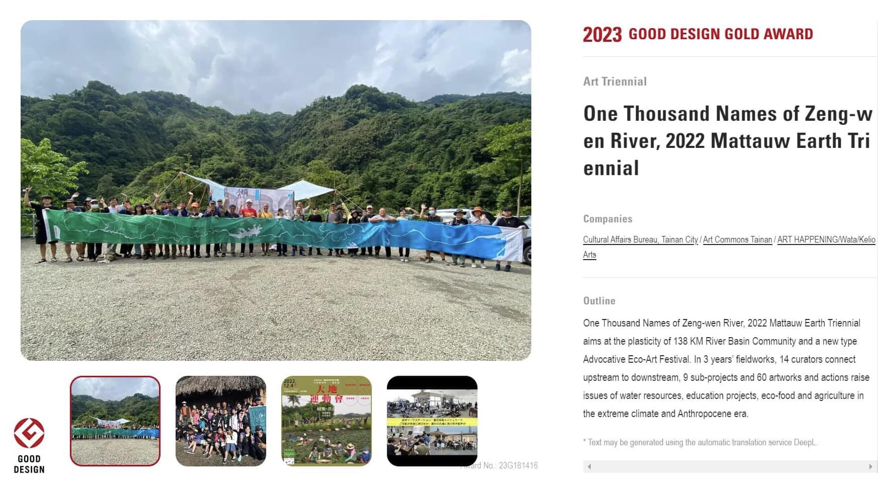 由臺南市文化局及國立臺南藝術大學藝術創作理論研究所教授龔卓軍策展的「2022 Mattauw大地藝術季─曾文溪的一千個名字」,不僅榮獲世界四大設計獎之一、素有東方設計奧斯卡美譽的日本優良設計獎「GOOD DESIGN AWARD 2023 Best 100」肯定.主辦單位更於東京時間10月5日下午1點半,宣布獲選為20名「GOLD AWARD金獎」得主名單,成為臺灣今(2023)年唯一獲得該國際設計獎項金獎肯定的藝術行動。