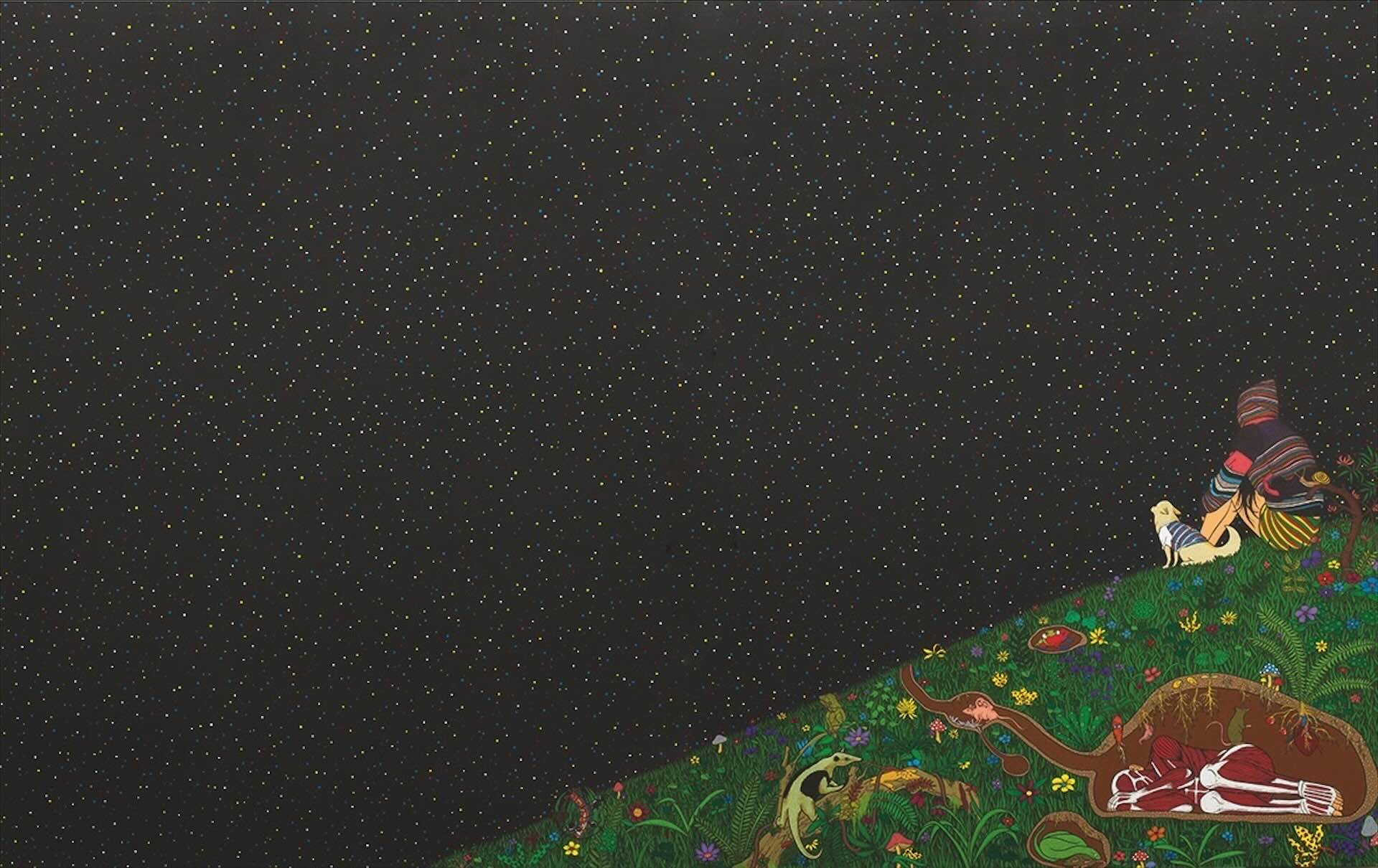 近來作品價格節節攀升的陳飛,其近4米的雙聯大作《星星堆滿天,我還是只愛月圓》,更是自藝術家2011年北京今日美術館個展後,首次於市場曝光。陳飛的作品內容多半圍繞著日常生活,細膩地描繪個人情感與對生活的種種觀察、感受與價值。畫面中坐在草坡上的人物是藝術家最親密的伴侶,與愛犬相互依偎著仰望滿天星斗,可謂藝術家迄今最浪漫的一件巨作。