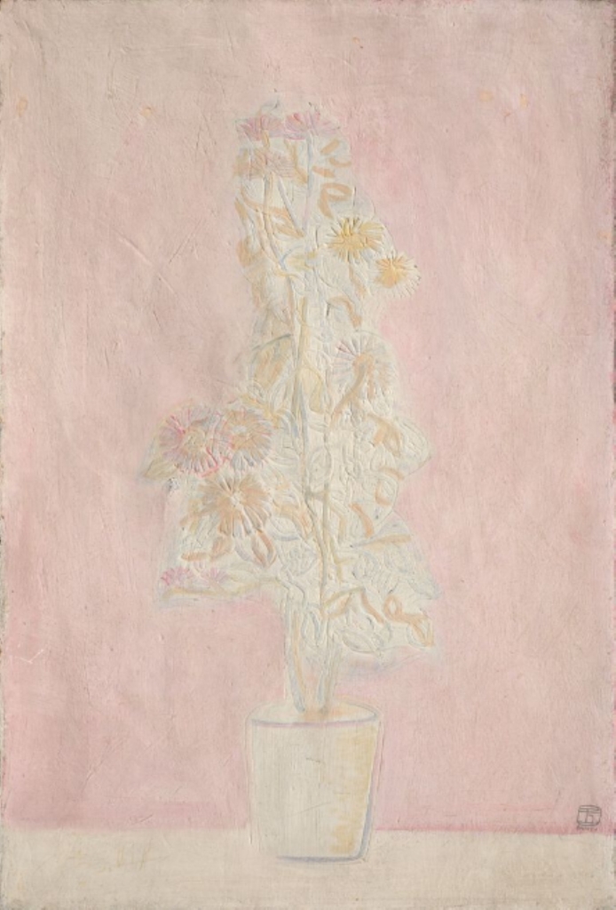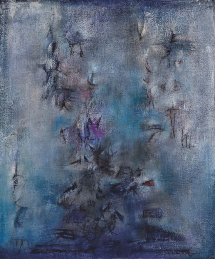 趙無極的《花》使用不同的顏色來渲染甲骨文字符,畫面中的字元與層疊背景相輔相成,字元符號幾已幻化無形,僅留似甲骨文般的線條在畫布上隨興遊走。這些漂浮的字母營造了視覺上如音符般的韻律感,充滿活力和生氣。