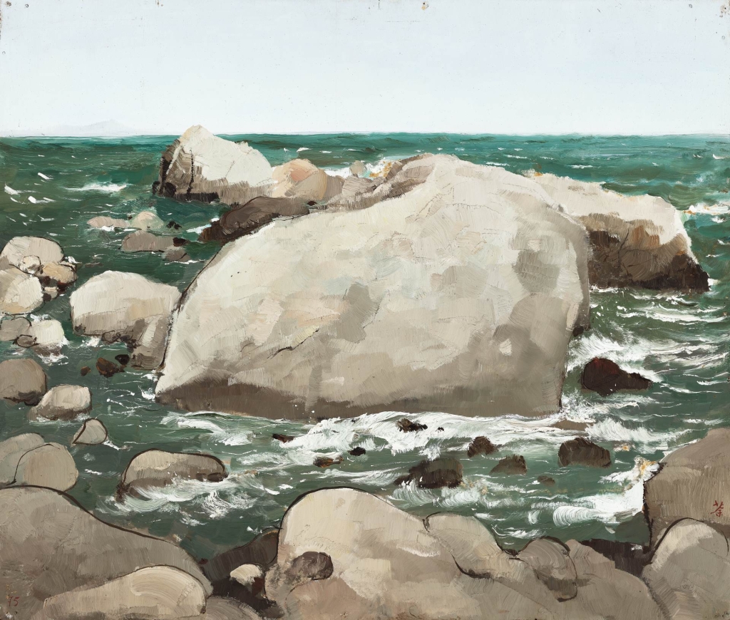 吳冠中作品《嶗山海邊(一)》中岩石纖細的黑色輪廓線強調了它的體量感和靜態,而厚塗的白色海浪則表現出動感與活力。朱德群作品《生機盎然》以絲絨般的深紅色和金黃色為主色調,罕有的左右兩側明暗對立構圖,充滿戲劇感,彰顯藝術家六十載藝術生涯中不懈探索的陰陽和合哲學理念。