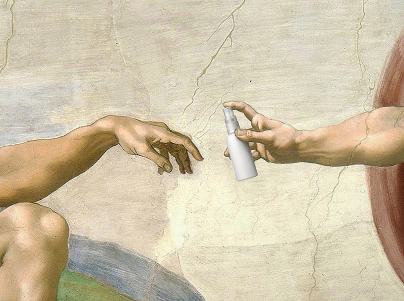 「用乾洗手」。原畫為米開朗基羅(Michelangelo)《創世紀》。(@Looma Creative)