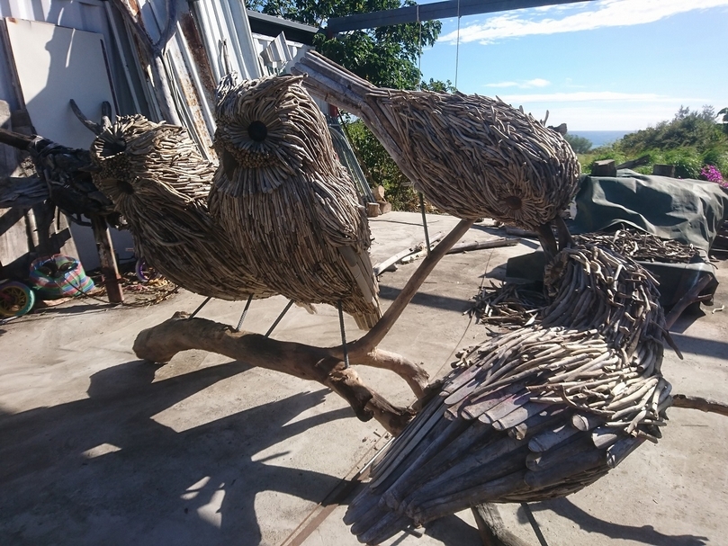 長年從事漂流木藝術創作的范志明與團隊成員們,以細枝漂流木搭配原住民族神話傳說,型塑出野生鳥類飛羽的外型樣貌。《原生‧飛羽》系列作品強調不砍樹、不崇尚名牌木材,應用漂流木細枝堆疊與拼接包覆,以鐵件做為骨架支撐內部,精準拿捏每一隻鳥類的外型、表情、姿態及神韻,期待讓這系列充滿木質溫潤質感的鳥兒,能輕快的「飛」進社會大眾的生活。