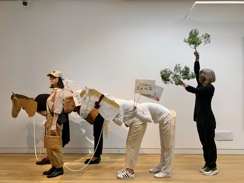高美館館員Cosplay藝術家林玉山作品《獻馬圖》。(高美館提供)