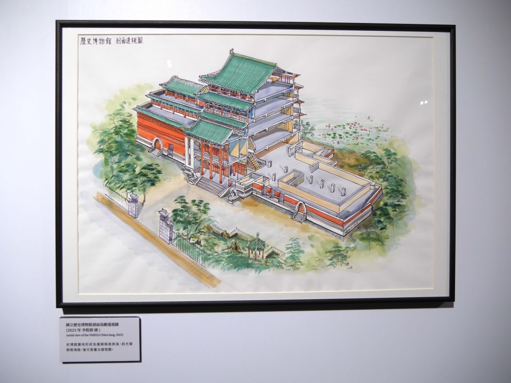 在整建工程前期 ,史博館意外發掘到日本時代(1916)迎實館遺構及榴木等殘件,為此調整修復工程,並於開館後首度公開此歷史遺構,為了呈現遣棟超過百年宮殿式歴史建築的擴建歷程,也邀請到建築學者李乾朗教授手繪史博館建館圖五蝠。