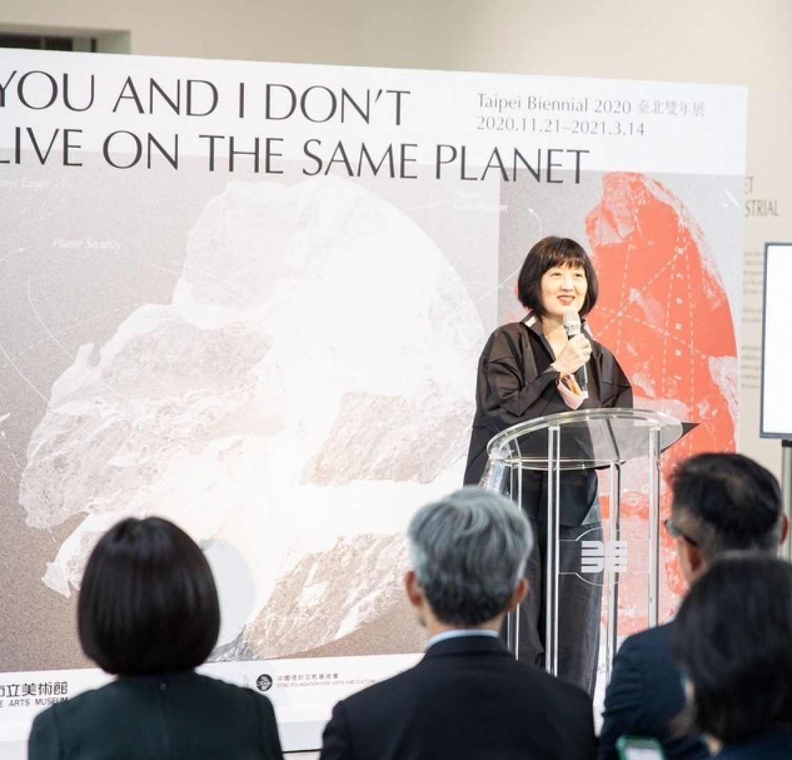 林平在2020臺北雙年展「你我不住在同一星球上」開幕記者會上發言。(臺北市立美術館提供)