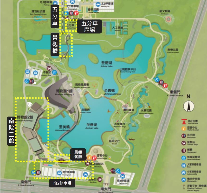 展覽將於北部院區及南部院區兩個場域共同舉行,北部院區著重呈現時代演進,回顧典藏沿革、文物詮釋及數位化等方面的發展及迥響;南部院區則聚焦於院藏巨碑式北宋山水,鎮院國寶北宋范寬《谿山行旅圖》、郭熙《早春圖》、李唐《萬壑松風圖》將首度於故宮南院展出,寫下歷史新頁。蕭院長表示,由於故宮南院不像北院位於都會區,因此出於推廣策略決定將鎮院三寶帶到南院,並配合百年院慶將積極規劃推出高鐵來回+飯店住宿+故宮門票等活動套票,吸引旅客前往南院參訪意願。
