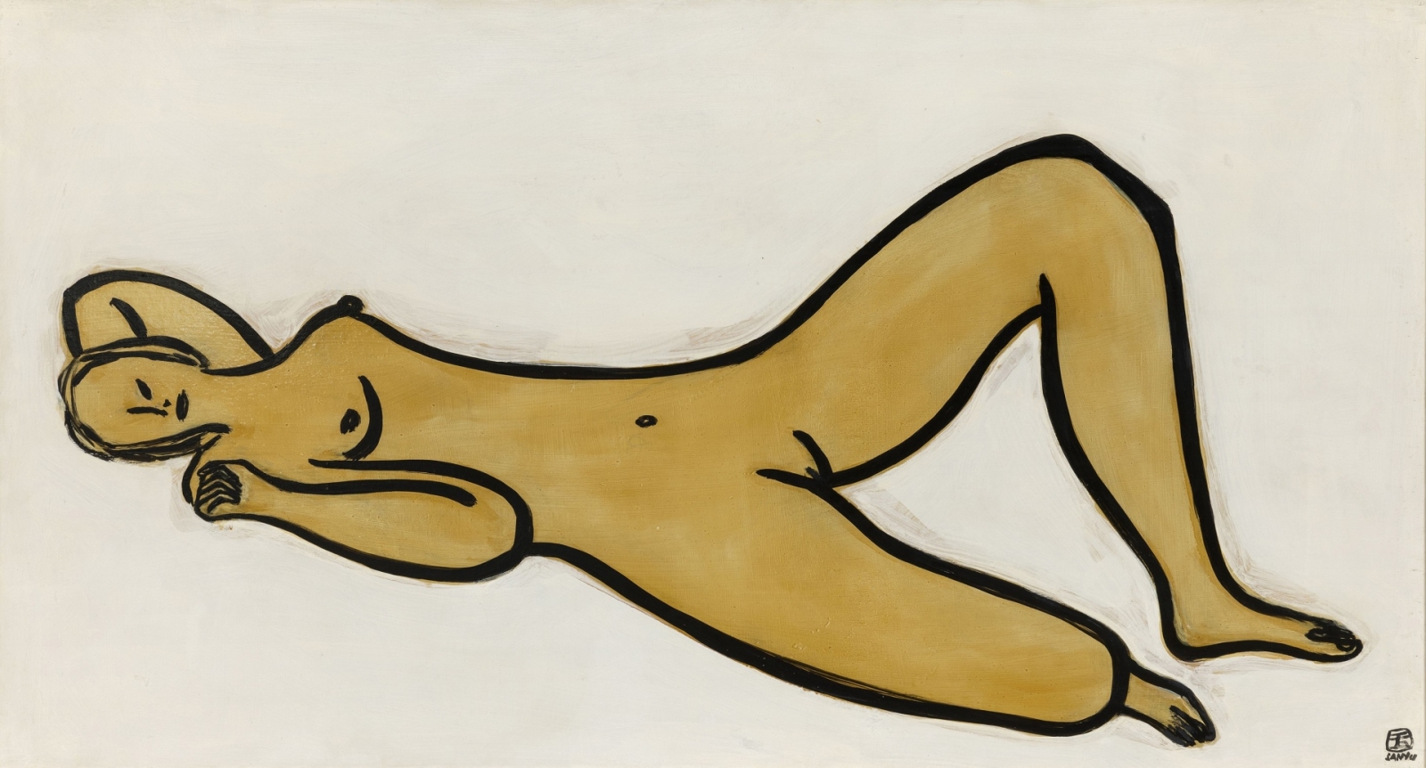 裸女是常玉畢生創作最核心的主題,從二十年代藝術家到達巴黎生活開始,直至六十年代的晚期創作,他在這個題材上不斷自我突破。常玉早期的作品幾乎都是裸體人物畫及素描,足見其對這個既陌生又充滿異國情調主題的著迷。雖然說此繪畫形式早已深植於西方美術傳統,但對當時的中國藝術家而言是截然不同的大膽創作元素。從五十至六十年代,常玉所創作的裸女不再如三十年代以粉紅色及柔和優雅的線條來塑造裸體,反而代之,他以東方山水的風韻、書法的筆觸,搭載西方現代主義,進一步展現他對線條掌握的淋漓盡致。有如本幅《曲膝仰臥裸女 II》呈現的畫面,運用有力的線條來勾勒出輪廓分明的人體,與乳白色背景形成鮮明對比,結合東方藝術底蘊來重新演繹西方經典,概括藝術家一生不斷琢磨的永恆主題。