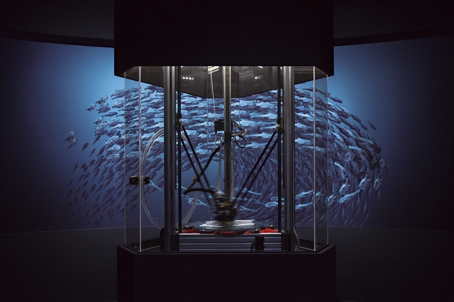 李小鏡最為人熟悉的系列,即是「十二生肖」乃至於「眾生相」系列,人與獸之間的臉譜變幻,折射出藝術家對人性的思考。李小鏡在九○年代即熟練運用蘋果麥金塔電腦的繪圖軟體,運用他那比常人敏捷數倍的電腦技術,在電腦螢幕上創作出令人驚豔的人獸眾生相。北美館推出的李小鏡大展,此次延續今年在國美館推出的「NEXT」系列,運用3D投影乃至3D列印技術,創造出了李小鏡心目中,未來地球巨變崩壞後,藝術家想像中的人類未來面貌。「終有一天,我們還是要回到水裡。」一條《人魚》作品,成為進入展場映入眼簾的第一件作品。李小鏡在6年前生了一場病,因為手術開刀切除甲狀腺,一度讓聲帶無法發音達3年,這些年他努力復健恢復聲音,也讓他益發珍惜生命。而這場病,讓他這10年探索人類未來的創作思考,帶給他更不一樣的體悟。