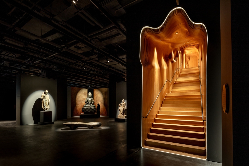 一條作為過渡的梯間通道引領訪客到藝廊的地下樓層,從繁囂的城市轉至隱秘的展覽區域。相比一樓明亮而開放的設計,地下呈現恢宏的空間秘境,呼應道家思想中的變化觀。空間靈感來自備受中國文化尊崇的供石,強調人與自然之間的平衡、持續適應和變化的理念,與當代社會中所重視的生態環保理念不謀而合。供石將道家思想實體化,亦是這個沉浸式空間的靈感來源,融會貫通古今。Grotto藝廊位處中央,緊鄰兩側分別是Pantheon藝廊與Sanctum藝廊,每個區域皆以深酒紅色和炭黑色的木材裝飾。樓高6米,高低錯落的天花板營造出石上的玲瓏峰谷、驟然起伏。這三處空間將呈現博物館級別的展覽、藝術表演及大型拍賣會預展。