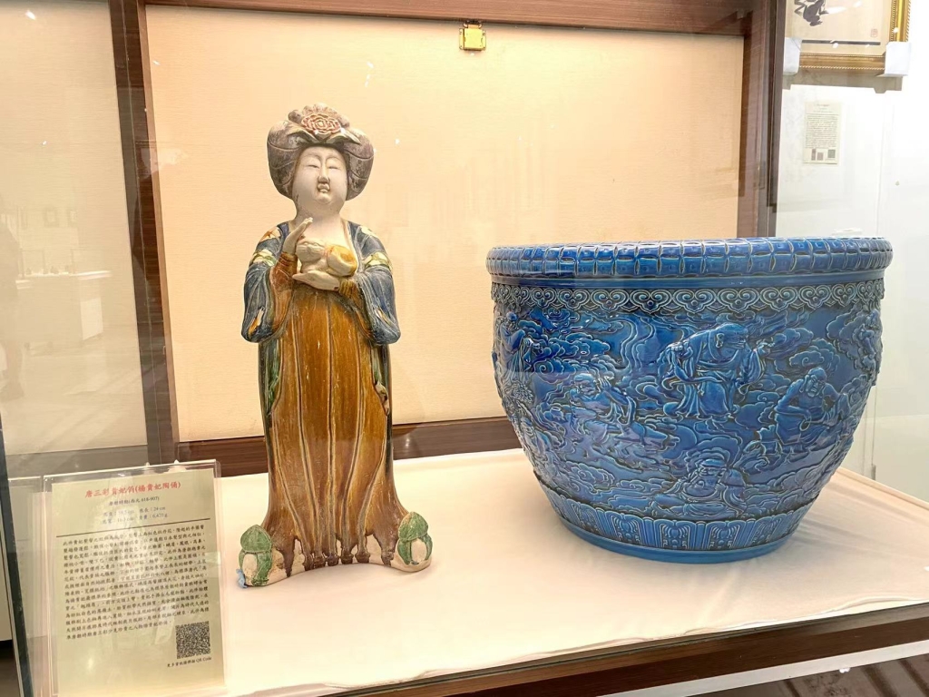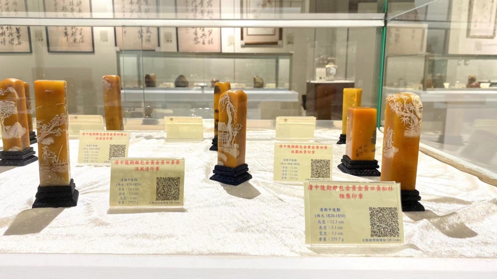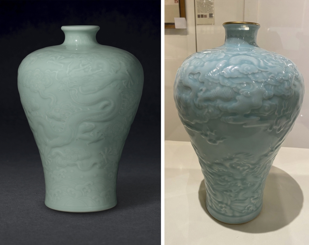 除書畫,器物展品資訊亦可見明顯謬誤,既高舉公益、教育之名,功課就應該做得更好,才能避免傳遞錯誤資訊,貽笑大方。以瓷器為例,其命名依序有著工藝技法、圖案紋飾、器型,以展中品名「清乾隆中期粉青釉軋道七海水雲龍戲珠梅瓶」為例。在此瓶中未看到「軋道」此工藝技法,該技法乃清代瓷器上新出現,清代乾隆朝琺瑯彩瓷上較為流行,以鐵錐於色地(胭脂紅、黃、藍地等)上劃出蔓草紋等規矩有序之紋樣,於文獻上稱為「錦上添花」,以此檢索臺北故宮器物典藏系統即可查閱諸多標準件。然而,此瓶似曾相識,似是以佳士得香港2022年秋拍清乾隆〈粉青釉雕海水龍紋梅瓶〉為本。佳士得香港此瓶,釉色清澈瑩潤,工藝精湛,浮雕中富層次,變化細緻,且紋飾歷歷分明,毫無「賊光」。以上的「似曾相識」,不僅令人憶起,曾逛過古董店,店主拿著每年度典藏出版的《文物大典》,指著某某拍賣公司拍出多少高價作品,現在店裡也有,只要多少錢的江湖故事。