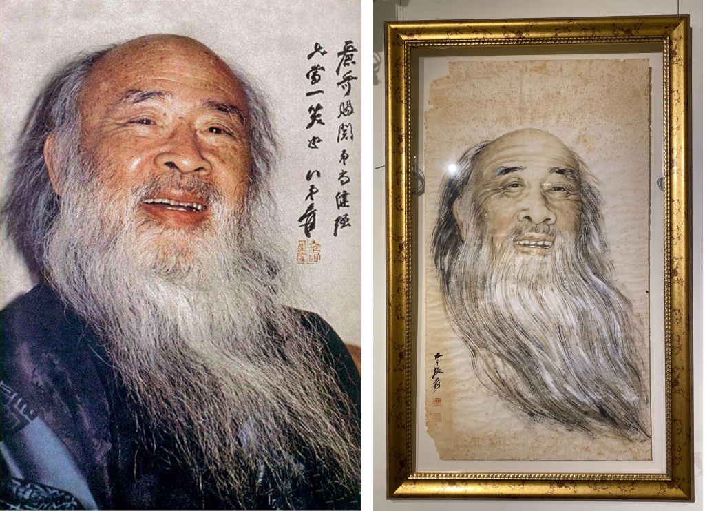 右:「倜儻筆墨」展覽中的「張大千〈自畫像〉」,95.5×54.3公分。(本刊資料室)