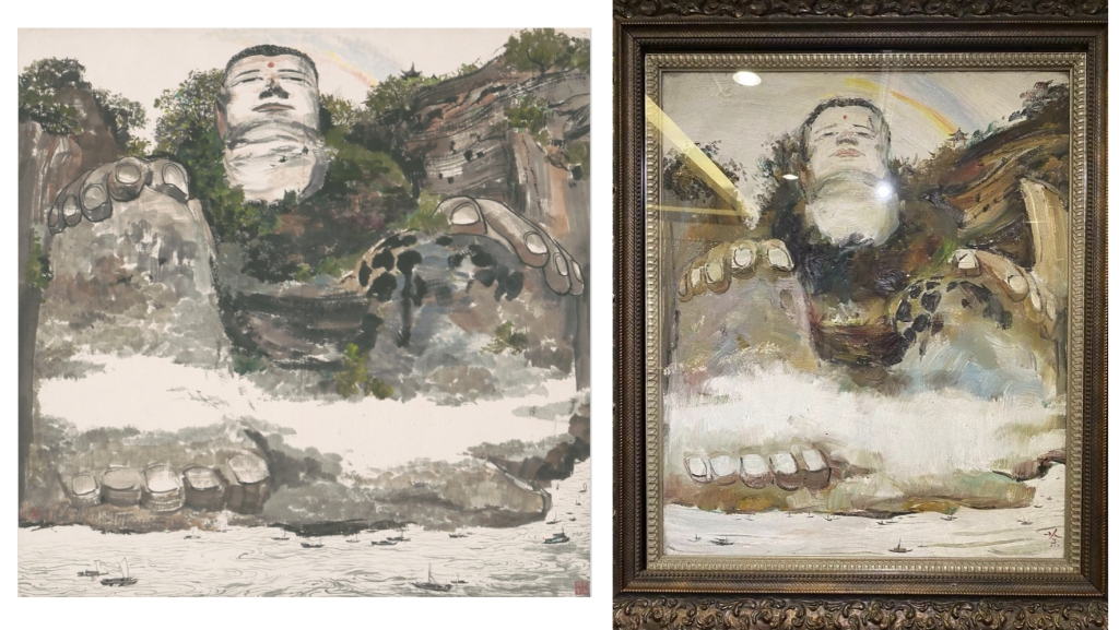 右:「倜儻筆墨」展覽中的「《樂山大佛》」(油畫)。(本刊資料室)