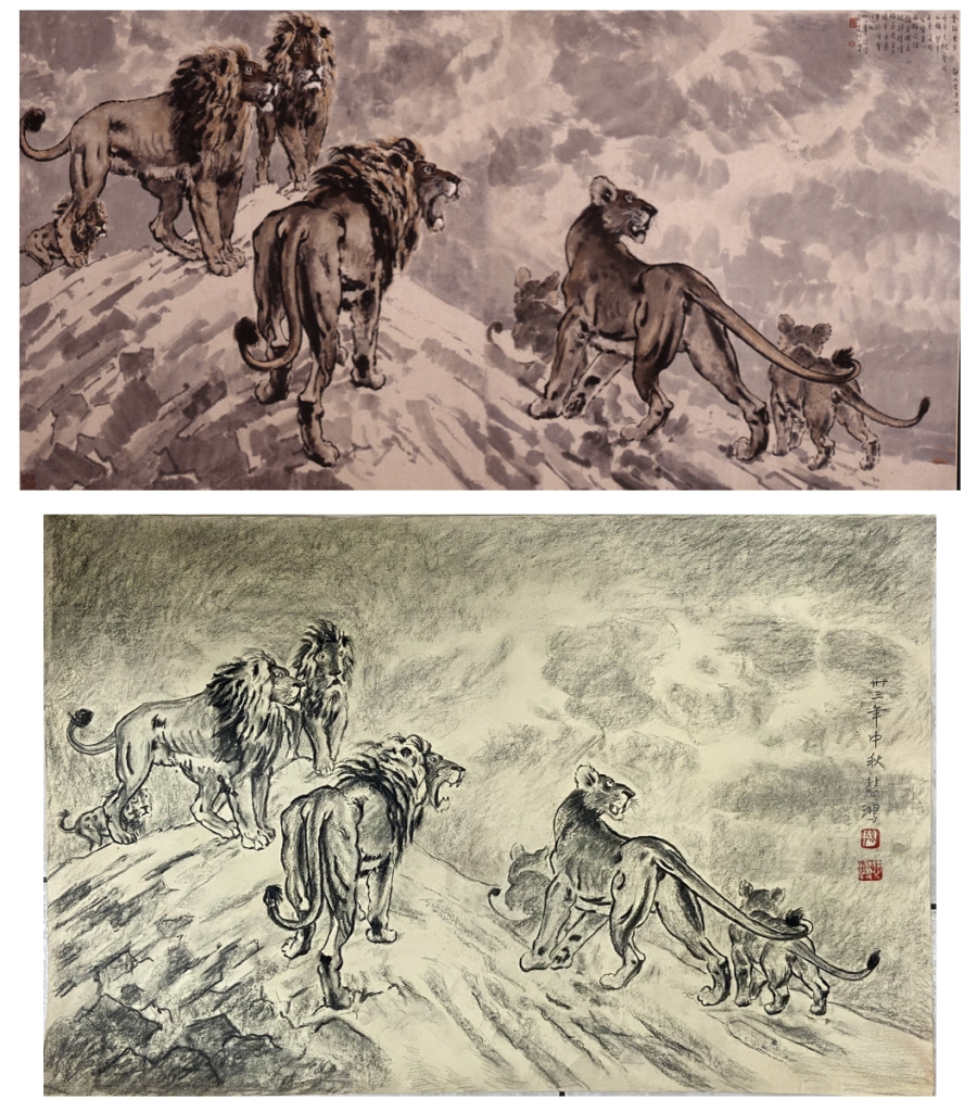 下:「倜儻筆墨」展覽中的「獅群」(素描)。(本刊資料室)