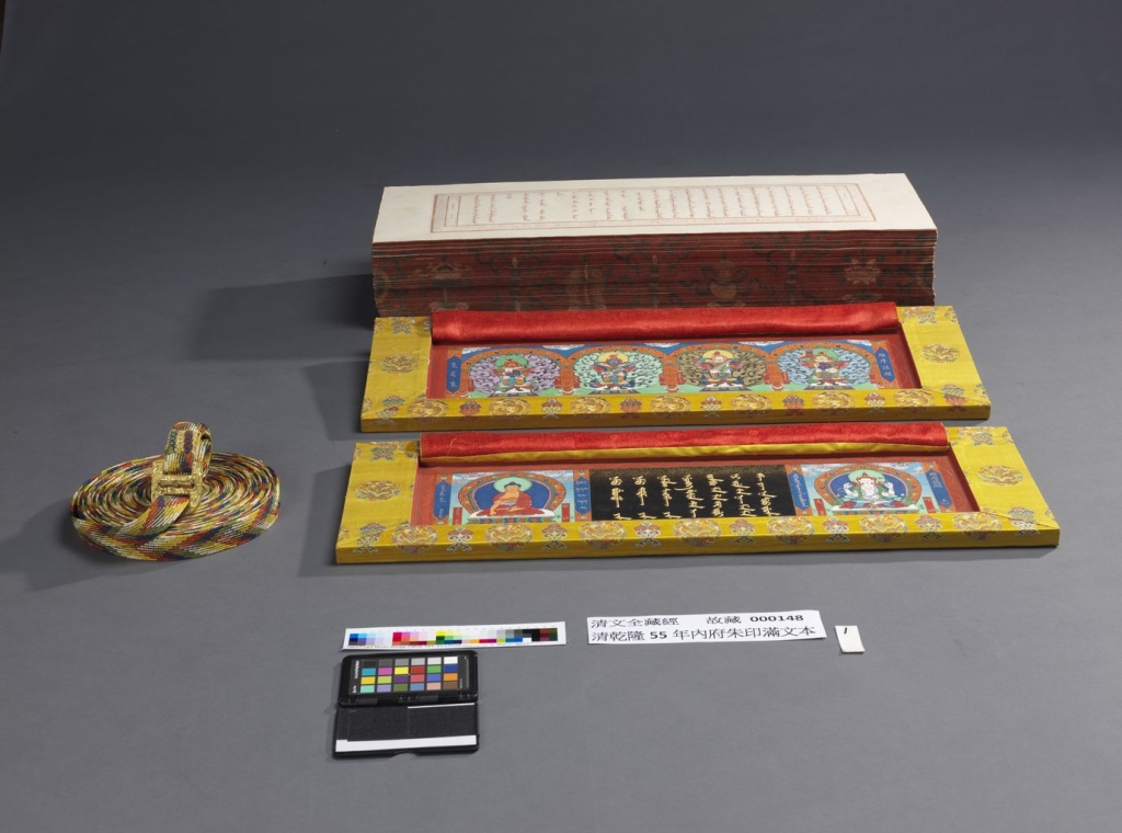 《清文全藏經》全名為《御製清文繙譯全藏經》,依滿文標題譯為《滿文翻譯大甘珠爾經》,現通稱《滿文大藏經》。乾隆37年(1772),鑑於蒙、藏、漢《大藏經》皆刊行,唯獨缺少滿文版,於是乾隆皇帝請第三世章嘉呼圖克圖若必多吉(1717-1786)負責這項工作,在內務府譯經處設立「清字經館」,以漢文藏經為基礎,對照蒙文《甘珠爾》進行翻譯編修。全帙共108函,採雙面朱印,初刷十二套,現僅存兩套:一套存拉薩布達拉宮三界殿(缺一函);另一套則分藏兩岸故宮,故宮典藏其中的32函。