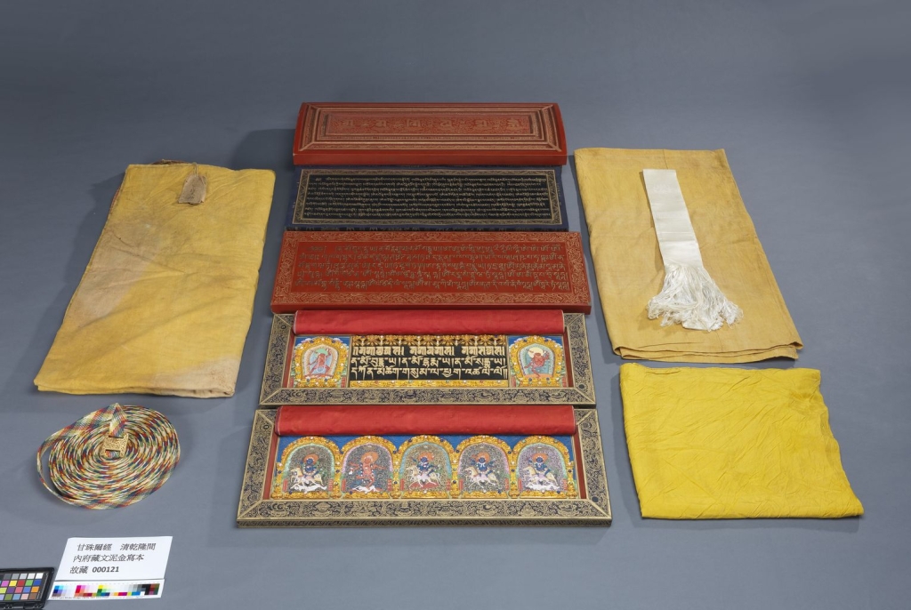 《藏文寫本甘珠爾經》是乾隆35年(1770)完成的藏文泥金寫本,應是為乾隆皇帝60歲與其母孝聖憲皇太后80歲祝壽修福所作。全帙108函,故宮存藏其中12函。各函經文首葉,以藏、滿、蒙、漢四種語文,記載該函經典目錄。除尺寸較小外,裝幀形制與康熙朝《龍藏經》相仿。