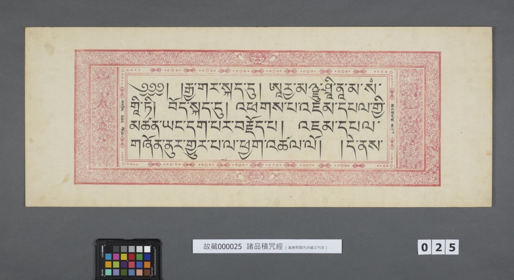 故宮所藏的兩函藏文《諸品積咒經》,均為傳統梵篋裝幀形式,一函為黑字寫本(部分為刊印),一函為紅字寫本。據跋文,均完成於康熙13年(1674)7月,收錄藏文密咒陀羅尼及經典,共167部。全函裝幀考究精美,經葉以藏文楷體鈔寫。藏文跋文多處提及抄經功德迴向,祈求康熙皇帝帝祚遐永,子孫綿源不絕,並祈願眾生心想事成、生活安樂。