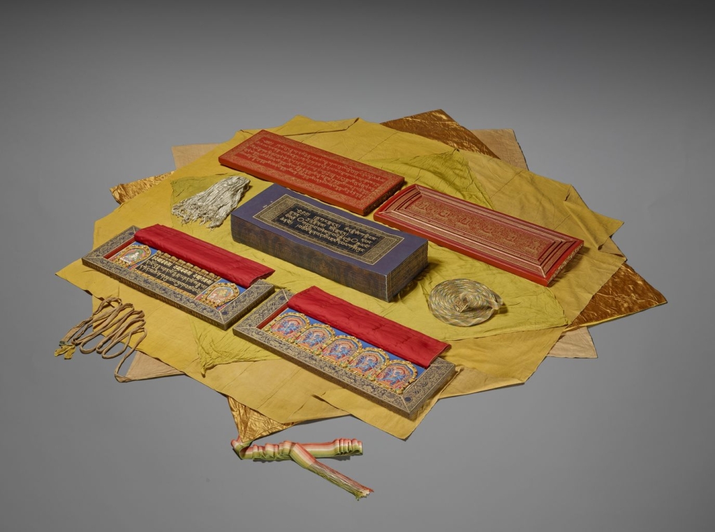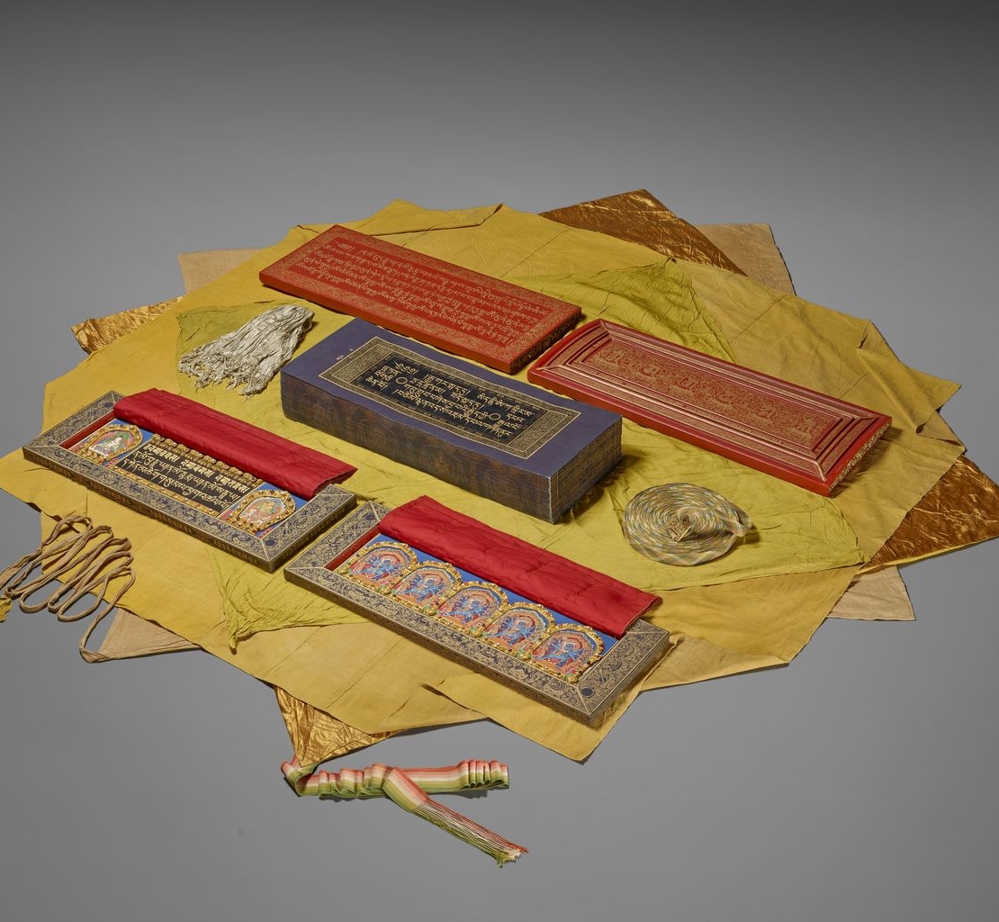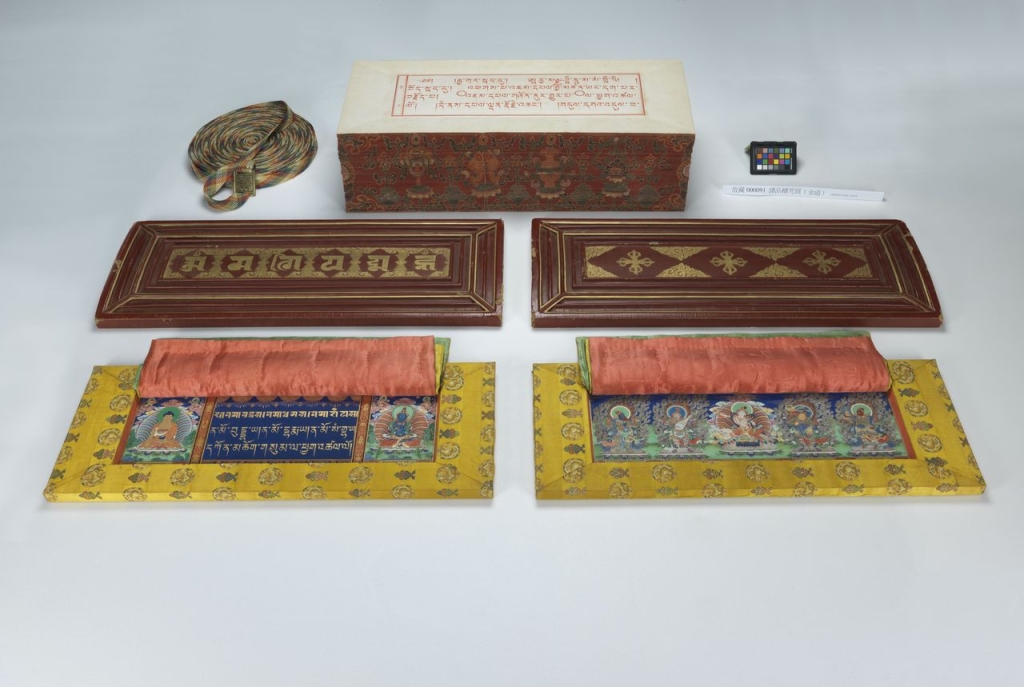 《藏文寫本龍藏經》共108函,是「甘珠爾」類別的佛教經典,意即「佛語之譯」,由清康熙皇帝的祖母孝莊太皇太后,於康熙6年(1667)下詔抄寫,至康熙8年(1669)完成。每函經葉上下,各有一內護經板,含金砌禮敬語與七尊彩繪造像,內容為佛、菩薩、本尊、護法、祖師等,並飾以各式鑲嵌珠寶,版面再護以黃、紅、綠、藍、白五色絲繡經簾。《龍藏經》裝幀考究、工藝精緻,是清代宮廷製作的首部藏文《甘珠爾》經典,具有深厚的宗教意涵,在歷史、藝術、語言和文化各方面也展現獨特的價值。
