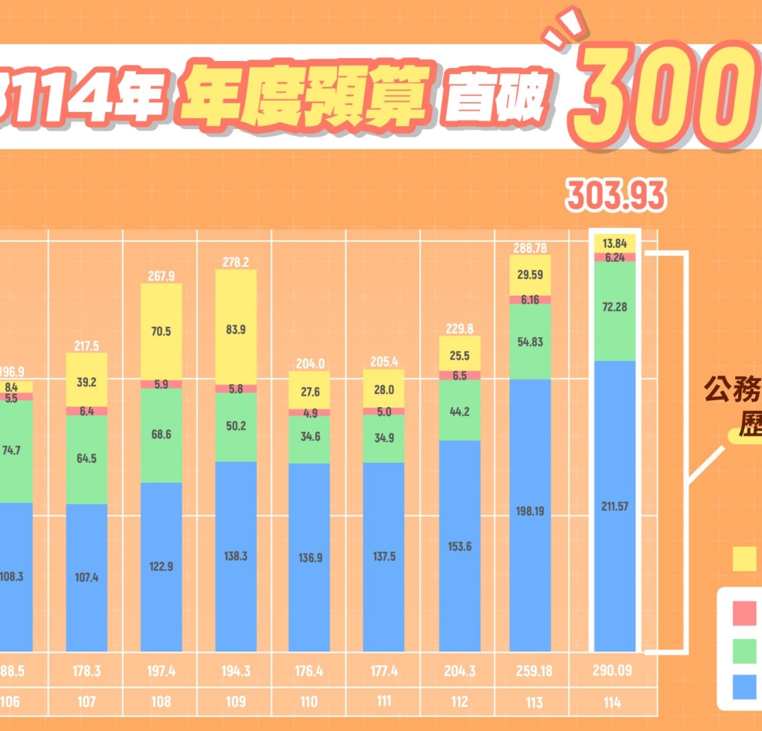 文化部說明,公務預算包含基本運作需求及法律義務支出、公共建設計畫、科技發展計畫等3項。114年度基本運作需求及法律義務支出編列預算211.57億元,較113年度法定預算成長13.38億元;公共建設計畫編列72.28億元,較113年法定預算增列17.45億元;科技發展計畫6.24億元,較113年增加800萬元。