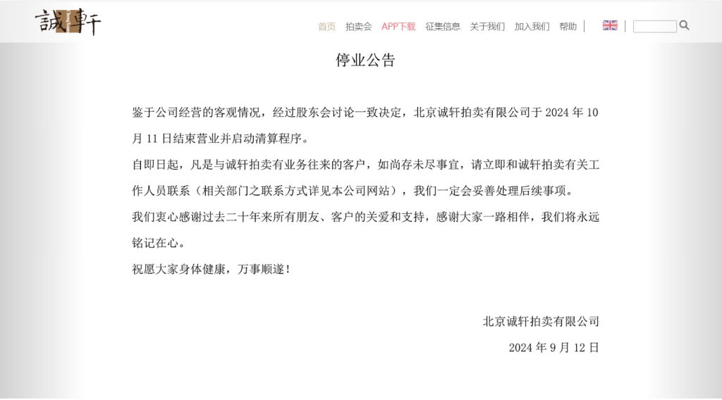 9月12日,北京誠軒拍賣公司官網發布「停業公告」。