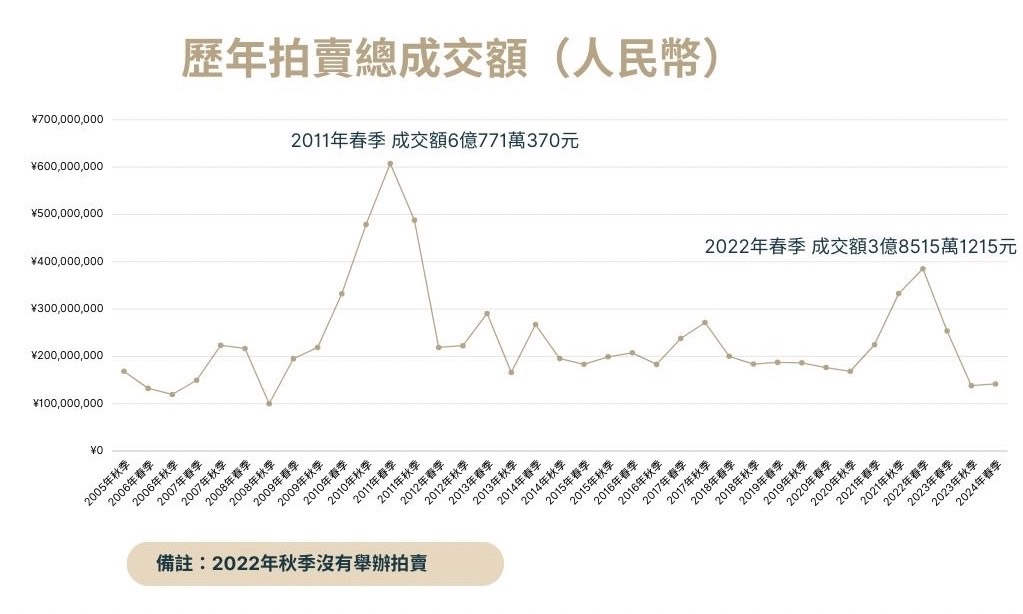 最後一場拍賣會,2024年春拍專場數最少,共有「錢幣(一)」、「錢幣(二)」、「中國書畫」、「瓷器工藝品」四場,成交額人民幣1億4170萬4495元,為37屆拍賣會中倒數第五成績。37屆拍賣會中,總成交額最低為2008年秋拍人民幣9989萬1408元,成交額最高為2011年春拍人民幣6億771萬370元。整體言,不論宏觀經濟的影響與否,誠軒一路走來,即便在市場熱度高峰期,亦從未大張旗鼓、虛華浮誇,以長期表現觀之,其經營方式持穩健型態,在拍賣公司中顯得相對保守。