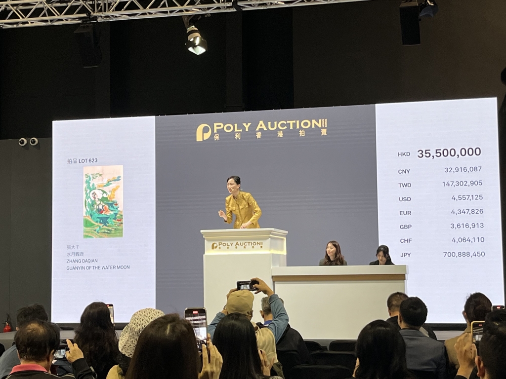 本場唯一一件的近現代書畫,也是本季書畫最高估價拍品——張大千《水月觀音》,為本季香港近現代書畫拍賣高價之冠,領銜群賢。估價2800萬至3000萬港元。甫一開場,拍賣官趙曌手中即有2800萬港元的書面委託,旋即由保利拍賣上海代表張瑾香港電話委託與北京電話委託連線,雙方展開競奪,以50萬港元的階梯有序推升,最終歷時近十分鐘,以3550萬港元落槌,由張瑾電話委託買家成交價4260萬港元喜得觀音。