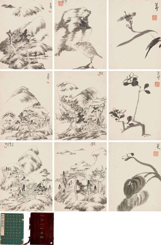 2.八大山人1698年作《山水花鳥冊》,水墨紙本冊頁,29.5×22公分×9,估價2200萬至3000萬港元,成交價2640萬港元。