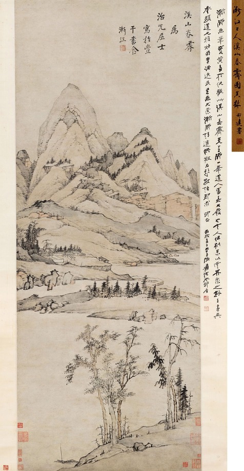 3.弘仁《溪山春霽》,設色紙本立軸,142×55.5公分,估價200萬至300萬港元,成交價456萬港元。