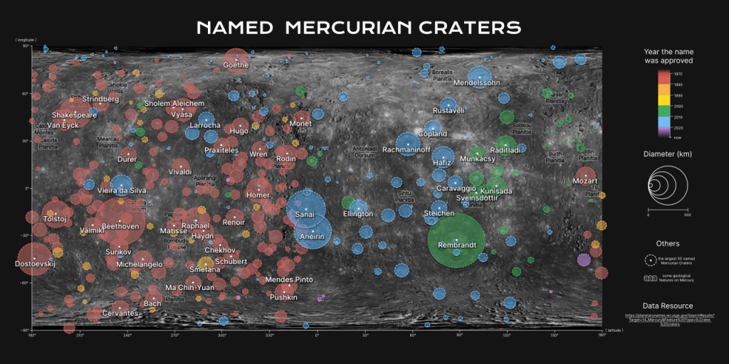 古往今來,文學家、藝術家、攝影家、音樂家、建築家等文化史各領域的重要人物都為人類文明作出巨大貢獻,他們不僅在地球上青史留名,也在水星上留下了印記。自1976年起,水星上的隕石坑就以人類歷史上的重要創作名家的名字命名:他們需要被公認為對人類文化有超過半個世紀的重要貢獻,並已過世超過三年。迄今為止,水星上已有437個隕石坑擁有了閃亮的名字。