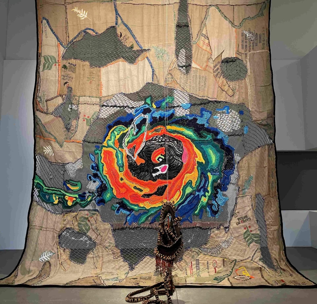 安聖惠特別創作全新大型裝置作品《恆久不變的信念》,靈感取自魯凱族的「wabacabacas」,意指手的動作體現思想、信念、歷史與文化。藝術家運用廢棄漁網、咖啡豆麻袋及各種線材,以古老的編織技法,從鳥瞰視角將衛星雲圖裡的風暴圈和行進中的颱風動向,定格在2023年曾侵襲臺灣的「小犬」颱風眼上,颱風眼交疊著風暴與QR Code,連結到數位化的人物訪談影像,探討原住民族如何在臺灣這座天然風災肆虐、國際政治風暴環伺的島嶼上生存,並正面迎向全球化議題的威力。
