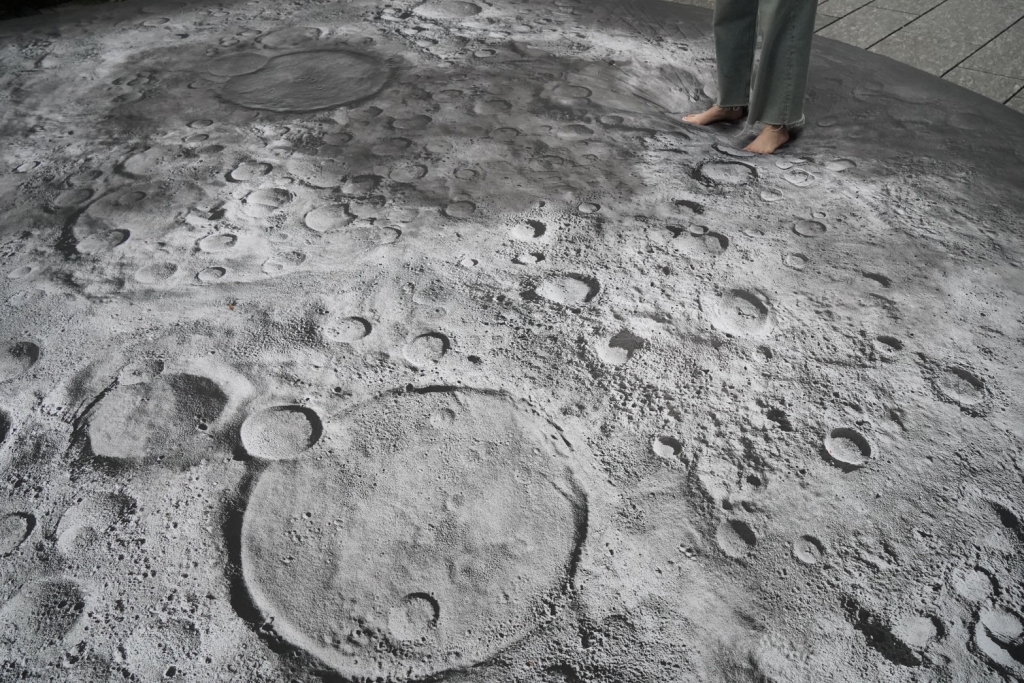 除了知名的《氰山集》以及《皴法習作》之外,藝術家更發表了全新的戶外裝置作品《臥月(Lying Moon)》——這件直徑六米的作品,其表面是吳季璁以棒球數次墜落至沙盒之後、創造出猶如月球表面般的影像。看似乾枯無水的表面,踩踏上去卻感受到裝置如水床搬的柔軟與流動,走動起來的觸感與水聲,則如置身在淺溪中行走,藝術家進一步裝設燈光於底部,讓《臥月》映照出銀灰色的微光。