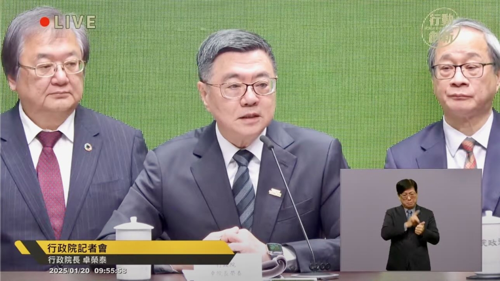 行政院於今日(20日)上午召開記者會,籲請立法院針對114年度中央政府總預算案再進行審慎評估。行政院院長卓榮泰、副院長鄭麗君、內政部部長劉世芳、農業部部長陳駿季、衛生福利部部長邱泰源、文化部部長李遠、數位發展部次長林宜敬、國家通訊傳播委員會代理主委陳崇樹、大陸委員會副主委梁文傑等人皆出席與會。
