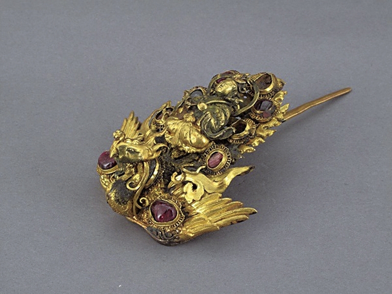 朱元璋建立大明王朝後,禮儀上復古制,玉器溯源中國傳統,大量用玉再現了古代中國玉器的精神象徵,以及在儀禮上的重要地位。明代玉雕工藝精湛,江西藩王用玉中可見各種精彩細緻的透雕鏤空作品,紋飾圖案亦展現江西地區的品味特色。展品中包括一件〈鏤雕喜字紋白玉帶板〉,每塊玉帶板上皆以喜字為中心紋樣,左右搭配帶有吉祥寓意的字符號,外框以簡單的花草紋圈圍,相當特別。展出文物亦可見女性貴族的專屬玉器〈穀紋青玉圭〉,「玉穀圭」是明代女性貴族的最高級身分象徵。藩王墓的金器則是極致華麗,展品中的一件黃金髮釵〈王母駕鸞金挑心〉,還鑲有彩色寶石,可以想見女性墓主生前的高貴榮華。