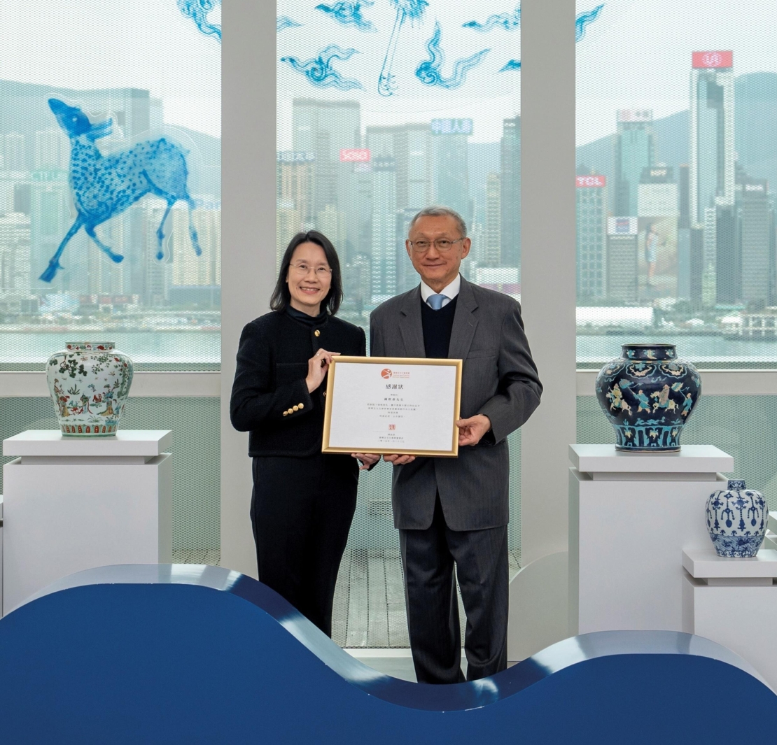 鍾棋偉自2018年起,已先後16次向香港藝術館捐贈共超過340件中國文物及書畫。最新捐贈的文物,均曾於香港藝術館2022年舉辦的「浮華.仙境─嘉靖皇帝的虛擬世界」展覽中展出。當中《青花海水雲龍紋壽字罐》器型碩大,燒製極難,一對行龍之間飾有以草書一筆寫成的「壽」字,為明代嘉靖時期象徵福壽延綿的常見紋飾,此大罐青料色調藍中泛紫,發色濃艷,展現出鮮明的時代特徵。這些文物不僅工藝精湛,更見證了晚明的藝術特色與文化面貌,具有重要的歷史與藝術價值。