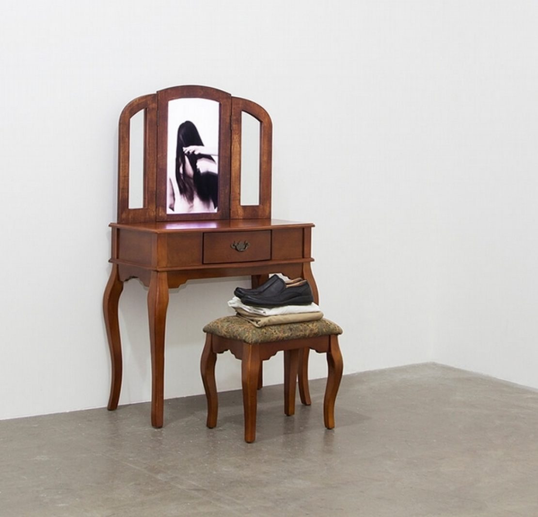 何倩彤《「明天你會為我綁馬尾。」》2015裝置 錄像: HDV / 13”梳妝檯: 135 x 41 x 77 cm 椅子: 47 x 31 x 44 cm 衣履與假髮:尺寸不定