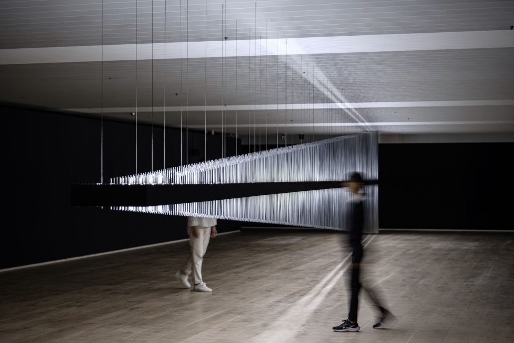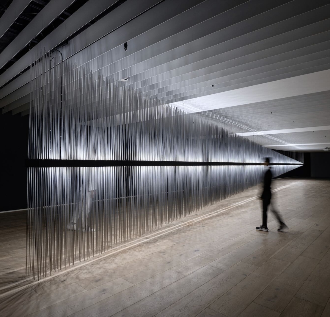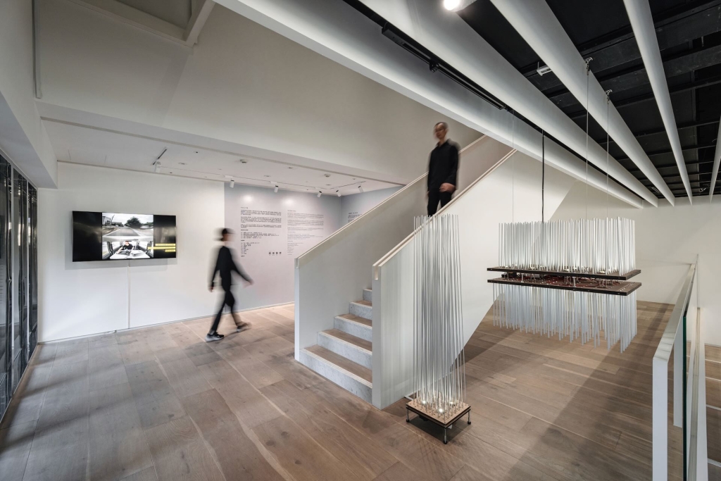 「光電獸」系列過往多在開放空間展出,聚焦於光源的流動。本展全新大型裝置《光電獸#41 – 混沌》於室內空間呈現,藉由與忠泰美術館空間的對話,量身打造獨特的感知體驗。在此環境中,聲響更具包覆感,作品以影子為核心,延續對光影與聲響流動關係的探索。作品透過鋁管長度的秩序變化與光影交錯閃爍,深化光與影的對話與敘事可能。