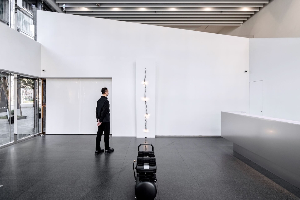 姚仲涵在本次展覽中開啟全新系列創作,首次嘗試以噴氣管與空壓機作為媒材,推出新作《漸強、漸弱與打氣》。作品擬人化地隱喻人生際遇的起伏變化,彈簧的擺動象徵混沌,而隱藏於作品背後的電子裝置設定,則規律運作,構築出秩序的框架。