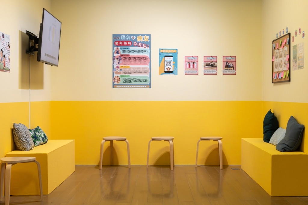 另外,值得注意得是,許佳安與吳梓和共同創作的《重新愛上美術館之旅&藝術傷病防治俱樂部》,以診所作為空間意象,回應藝術產業從業者常見的倦怠感。面對許佳安的「我再也不想看展覽了」,兩人設計出一套針對藝術疲勞的藝術傷病測驗,並結合團體對話與行動療癒,試圖在彼此傾聽與共感中,重新召喚對藝術最初的熱情。整體空間如同一次心理諮詢,也是一場為產業倦怠所設的集體修復行動。張育嫣與王雅璇則是聚焦於臺灣藝術產業中的「標案制度」。兩者對於所謂「甲方」、「乙方」的權力結構,提出兩個業界常見的荒謬期待:「通靈」與「用愛發電」,以此拆解不對等合作中的語言與結構,提出制度反思與合作可能的具體實踐。