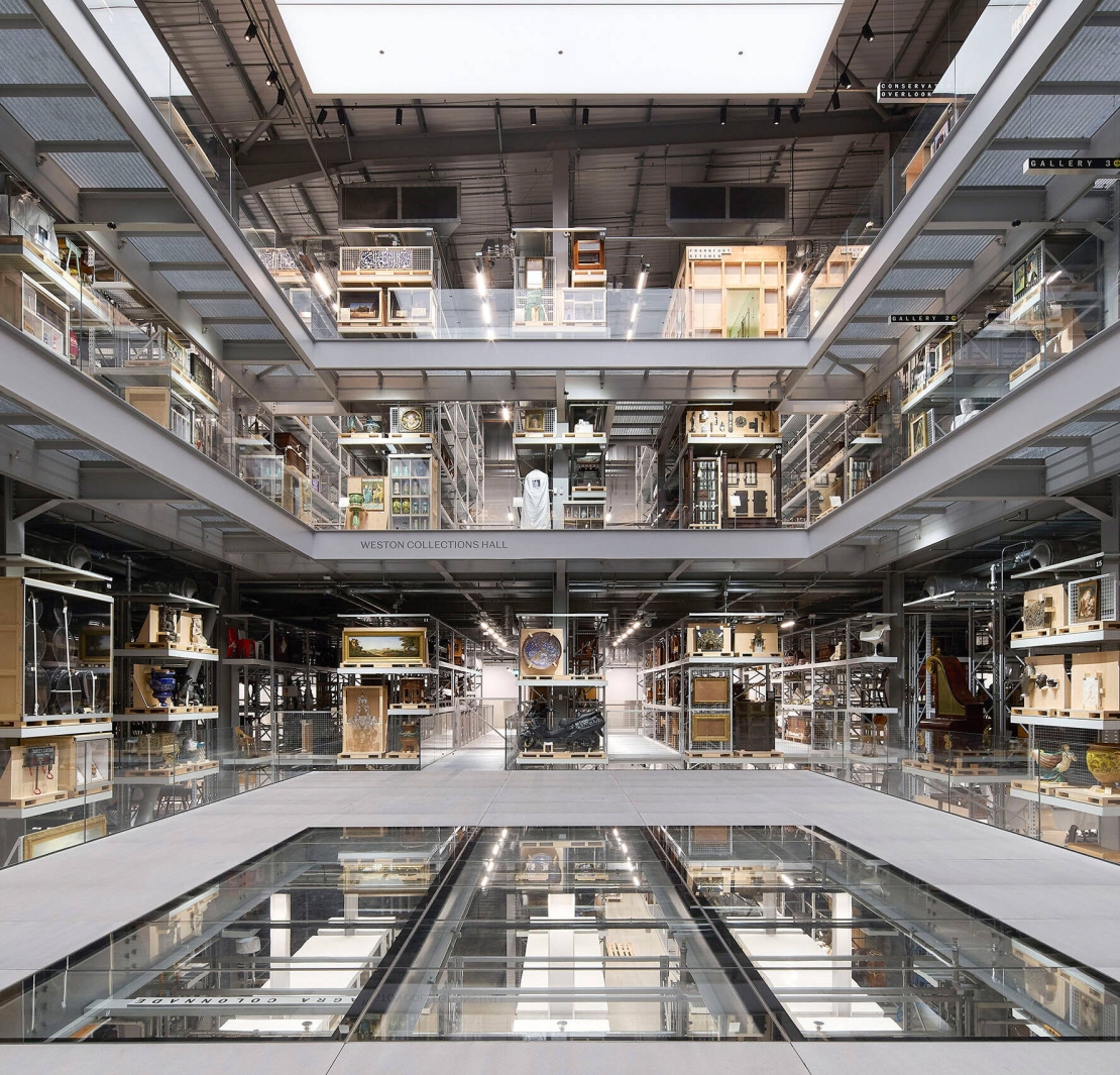 這座「倉庫式博物館」設置玻璃走道、觀察窗與開放工作室,讓觀眾可以透過玻璃地板俯瞰下層所藏的阿格拉大理石柱廊(Agra Colonnade),亦可從工作室觀察修復、策展人及藏品搬運過程 。庫房內無固定展件,以開放式高架儲存空間為主,配合QRcode和迷你策展展示區(hacked displays),供觀眾自由探索、觀察博物館如何收藏、整理與保養館藏 。