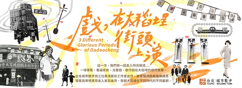 這次台北城市散步規劃《戲,在大稻埕街頭上演》因去年迴響熱烈,今年二度舉辦,觀眾將隨著導覽員的腳步,在街頭與戲曲演員不期而遇,一探三個不同年代的大稻埕:1960年代壓抑中追逐夢想,1940年代徬徨時尋找方向,1920年代歌舞昇平、華麗登場,以歌仔戲、北管、京劇演出,融合在過去曾經的劇場景點與戲曲特色,呈現大稻埕的故事。8月29日、9月5日、9月12日週六下午各有三個梯次,於捷運大橋頭1號出口出發。