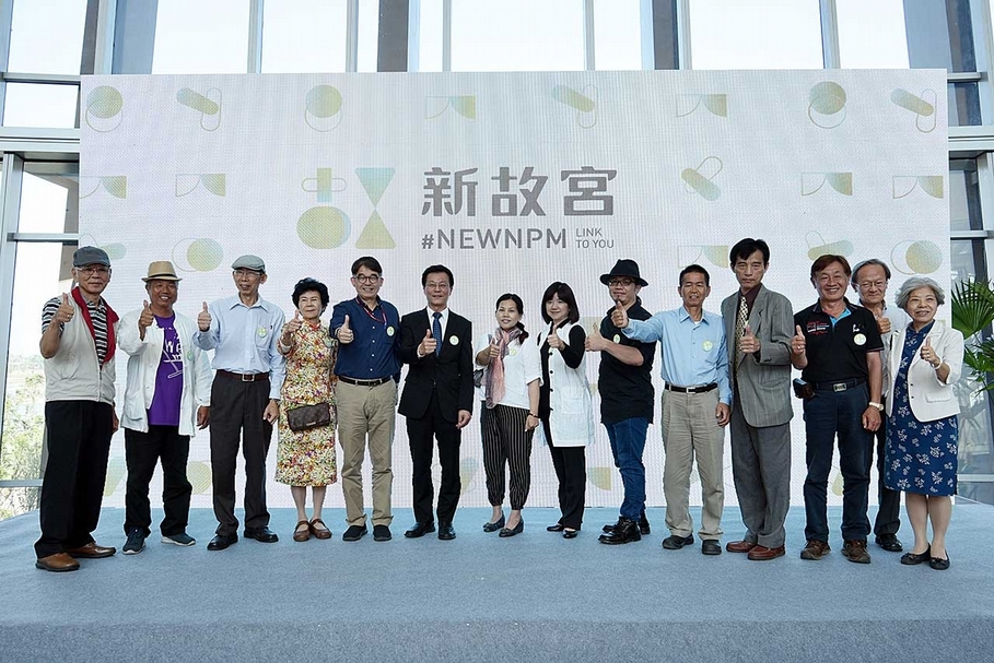 國立故宮博物院院長林正儀、政務副院長李靜慧、常務副院長黃永泰和嘉義縣文化觀光局局長許有仁、嘉義市文化局代理局長、新港文教基金會董事陳錦煌、新港奉天宮總幹事李進興及新港香藝文化園區董事長陳文忠等貴賓合影,一同喊出「新故宮,好作伴」。(國立故宮博物院提供)