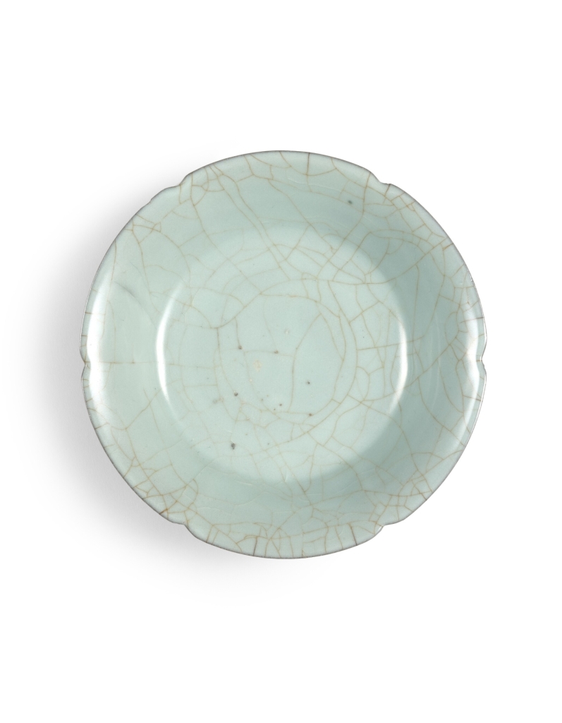 南宋官窯之奇,尤在其盛名煊赫九百載,然燒造之謎至今未解,其專為杭州宮廷燒造,後代藏家夢寐以求而難得一窺真容。南宋美學受儒家「守成」與「革新」兩派思想影響,故而本品造型簡練優雅,釉面冰裂紋天成,既延續北宋宮廷品味,又展現新時代美學追求。此盤形制看似簡約,實則匠心獨運:口沿六處微凹即成葵瓣,斜腹窄足更令整器若淩空懸立。並為英國著名數學家、漢學家哈利・加納爵士(1891- 1977)舊藏。兩度經繭山龍泉堂易手,後入伊勢收藏,展覽出版著錄累累。