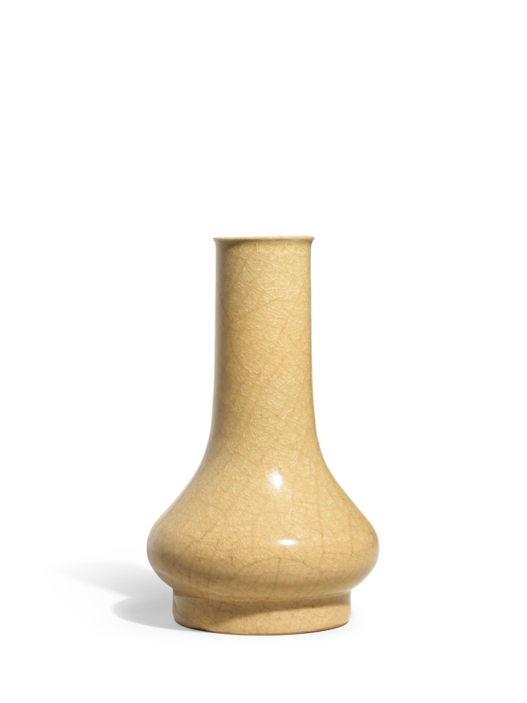3.南宋《官窯米黃釉直頸瓶》,高22.3公分,估價800萬至1600萬港元,成交價2477萬5000港元。